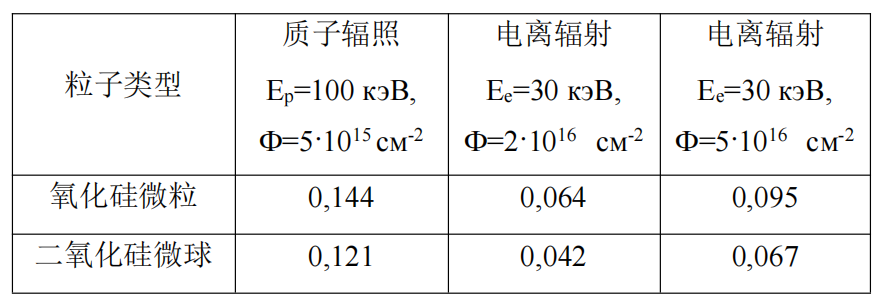 太阳辐射吸收系数变化Δαs的计算结果表明(表1)基于二氧化硅微球的涂层具有最高的抗辐射性。质子辐照后(Е=100 кэВ, Ф=5·1015 cм-2),二氧化硅微粒涂层的Δαs最大值为0.144。对于带有微球的涂层,该系数值低于16%。电离辐射后,在Ф=2·1016 cм-2和Ф=5·1016 cм-2下,二氧化硅微粒涂层的Δαs也达到了最大值。对于基于微粒的涂层,Δαs的值随着能量密度的增加而增加,增加了32.6%。用于基于中心二氧化硅颗粒的涂料增加了37.3%。在Ф=2·1016 cм-2时,二氧化硅微球涂层的Δαs值比微粒涂层低34%,而在Ф=5·1016 cм-2时,Δαs值低于40.5%。