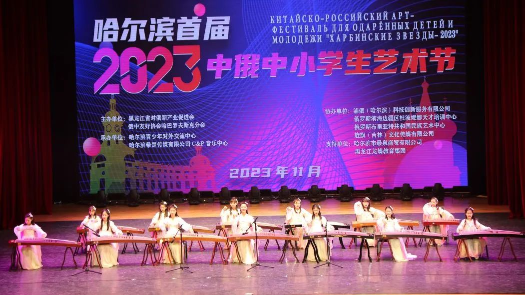 俄罗斯孩子来一曲中国风怎么样?只见跳芭蕾的女孩子们穿上了中国的绫罗,长衣飘飘,手拿一把粉色扇子,舞姿翩跹,步步生莲,如俄罗斯七仙女下凡。深目高鼻金发碧眼的女孩子,手持一把扇子,竟也端凝起来。 芭蕾舞是这次汇演的靓点,不仅俄罗斯的杜波妮娜古典芭蕾舞团跳出专业水平的芭蕾舞,中国的各个艺术学校,芭蕾舞学校的孩子们也都纷纷表演出令人惊艳的芭蕾舞,孩子小小的,气场却大大的。 乐器演奏类节目很多,除了小提琴,民族乐器经由孩子们的小手发出了中华民族的清音。尤其令人震撼的是古筝合奏。十三台古筝齐奏,犹如空谷回音,意境悠远,荡气回肠。中国女孩子们和古筝一起,演绎出中华民族的气质,端雅安宁。 舞台上,可爱的孩子们不仅让家长,也让观众心生爱怜。色彩绚丽的妆容、服装和灯光下,无论中国还是俄罗斯的小演员们,身体和小脸都像花儿绽开了一样。 2023哈尔滨首届中俄中小学生艺术节圆满落幕,各位领导为孩子们颁发了奖项,送出真挚的赞美和殷切的希望。接过奖项的中俄老师和孩子们,露出甜美而灿烂的微笑。