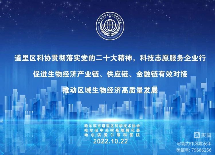 0月22日下午,道里区科协充分发挥自身业务、服务优势,与合作方哈尔滨中关村基地孵化器携手生物产业、金融创投领域的专家,采取线上线下相结合方式,组织辖区生物医药企业20余家,在辖区企业“爱尔眼科”,举行了生物经济产业对接合作研讨会。